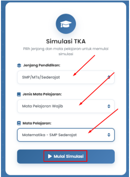 2. Jenjang Pendidikan Pilih yang SMP, Jenis Mata Pelajaran pilih Mata Pelajaran Wajib, Mata Pelajaran pilih Matematika atau Bahasa Indonesia, kemudian klik MULAI